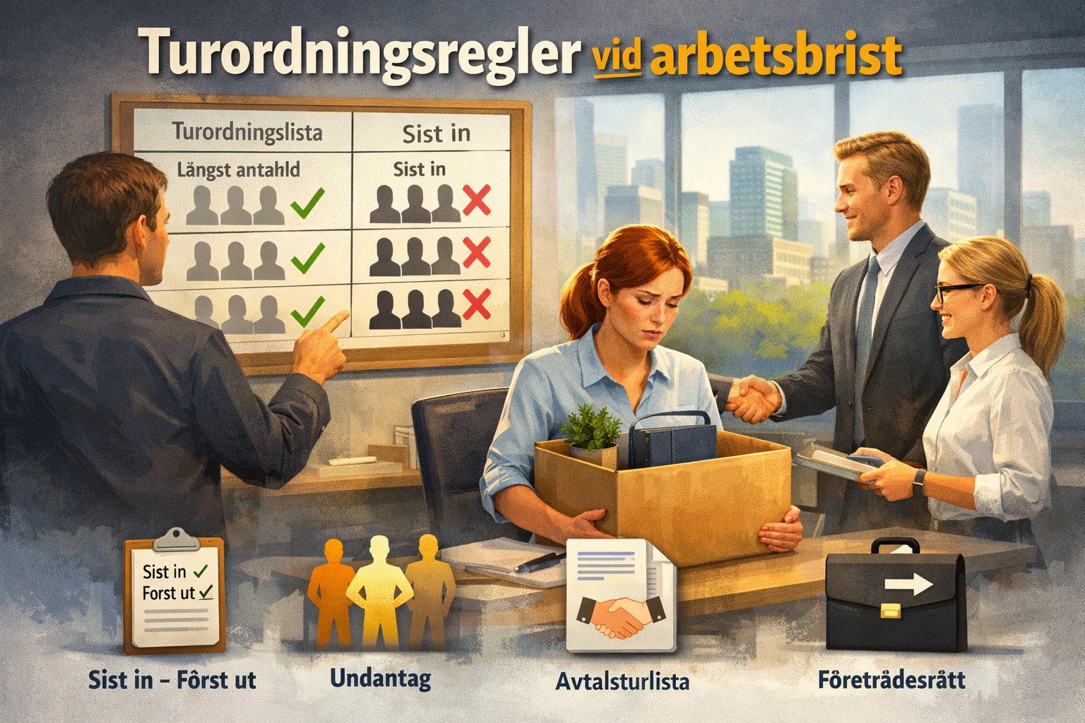 Vid uppsägning på grund av arbetsbrist gäller särskilda turordningsregler enligt lagen om anställningsskydd (LAS). Reglerna avgör vilka arbetstagare som ska sägas upp när en arbetsgivare måste minska personalstyrkan.